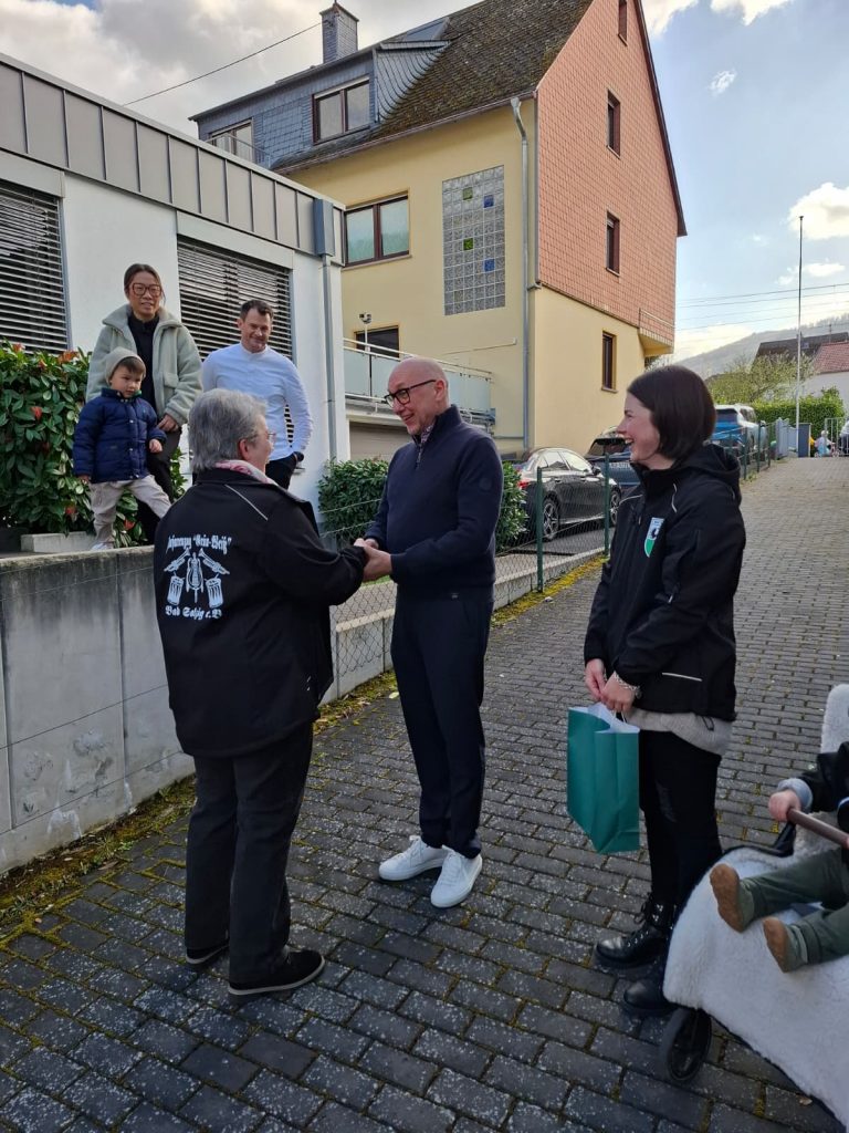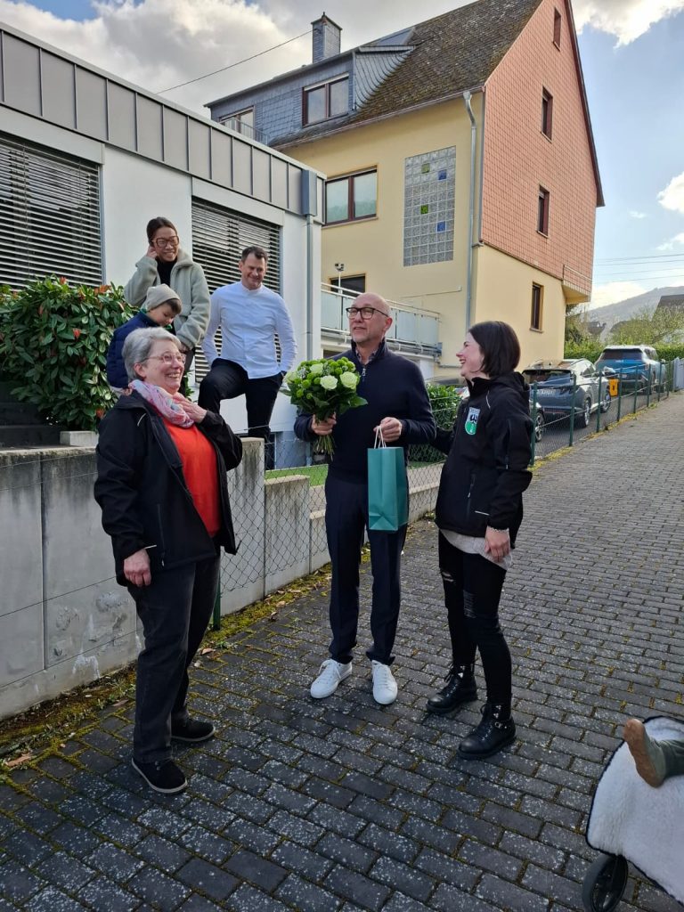 Neben dem musikalischen, überreichten wir auch den obligatorischen grün-weißen Blumenstrauß und das dazugehörige Geschenk: Ein Holzbrett mit eingebranntem Fanfarenzug-Logo.